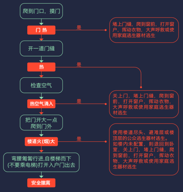 不过,当你半夜醒来发现楼里发生火灾,并发现楼道已被浓烟封锁,那么你关上户门等待消防队救援或利用逃生绳、逃生缓降器等专用逃生避难器具从窗口或阳台逃生,生存几率要显然高于冲过浓烟下楼梯逃生。以下的图告诉你在逃生与闭门待援之间做选择的步骤和方法。