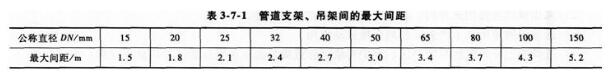 1)管道应固定牢靠,管道支架、吊架问的最大间距应符合表3-7-1的规定。